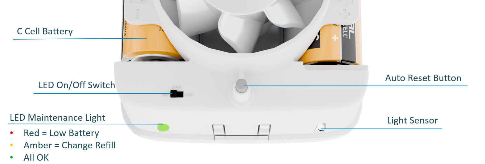 Insert the refill. Insert the batteries. Close the cover. Mount the dispenser. Leave for 30 Days.