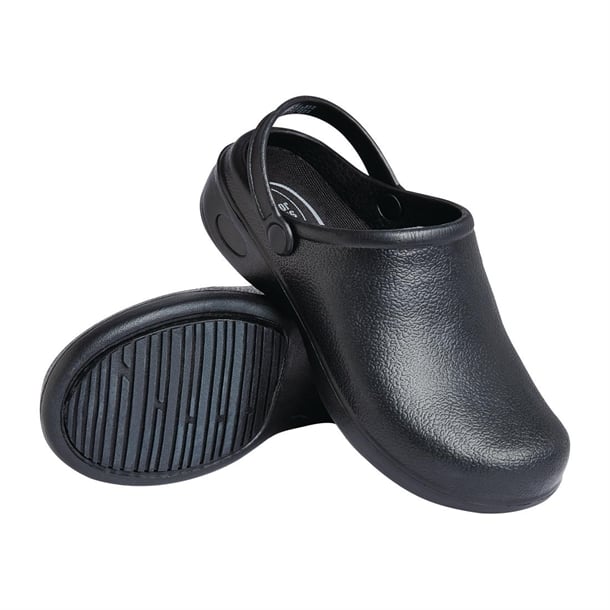 Capital Black Chefs Clogs (dual-sized UK) are designed for comfort and safety during long kitchen shifts.