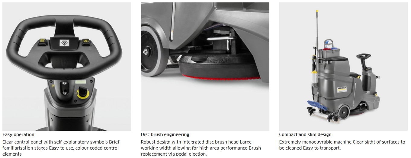 Driven by 105 Ah batteries (included with a matching charger), this reliable entry-level model provides excellent runtime and cleaning performance using robust disc brush technology. Its compact and slimline design allows operators clear visibility of the cleaning area, while simple colour-coded controls and intuitive operation reduce training time and ensure user confidence.