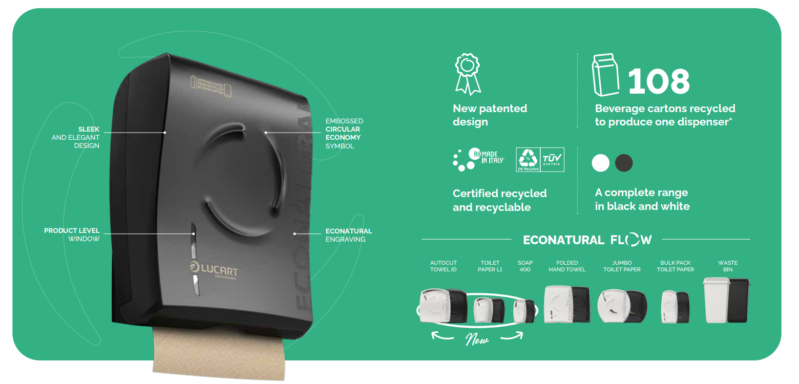 Available in black or white, the dispenser reflects Lucart’s commitment to design, performance, and sustainability. Fully certified under the EU Ecolabel, Cradle to Cradle, Blue Angel, FSC Recycled, and Green Electricity standards, the Econatural Flow Dispenser is ideal for eco-conscious businesses, hospitality, and healthcare facilities. It delivers reliable, professional performance while reinforcing your organisation’s commitment to the circular economy.
