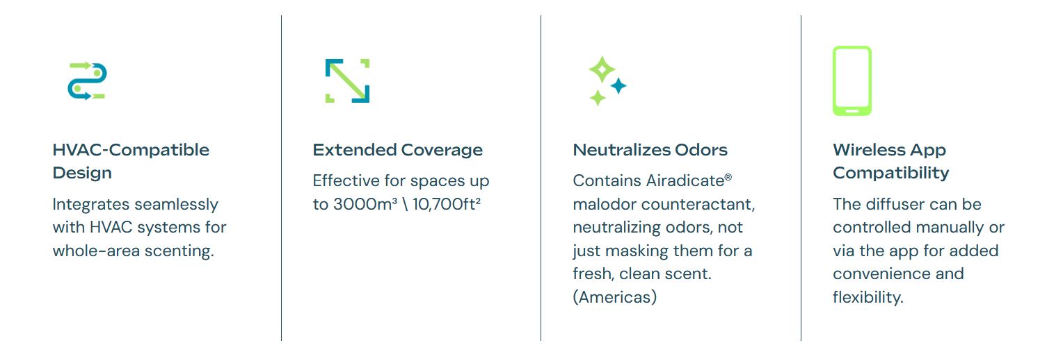 - HVAC Compatible design integrates seamlessly for full-area, uniform scenting