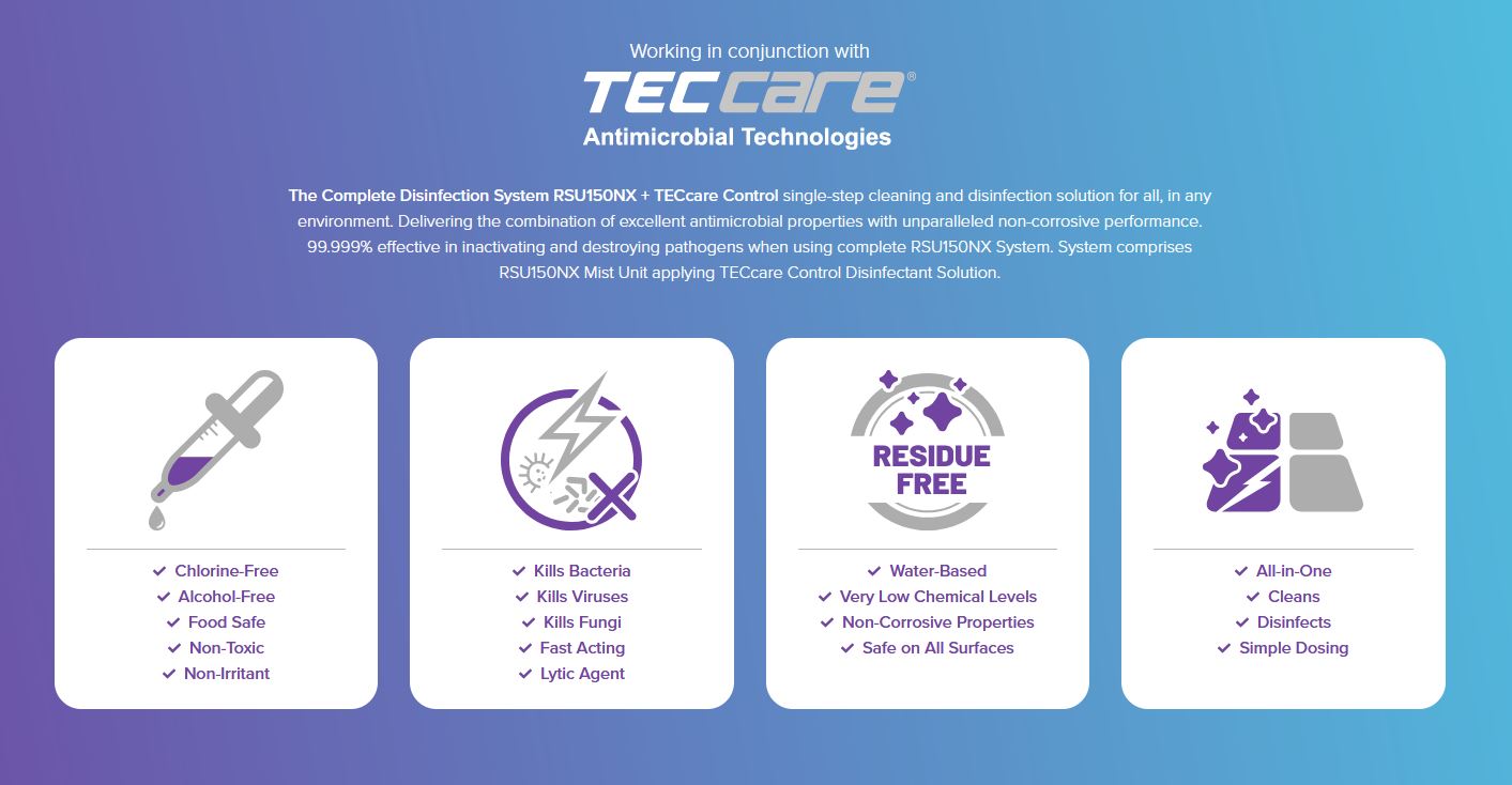 The TECcare Control formulation is powered by quaternary ammonium compounds, including didecyldimethyl ammonium chloride (DDAC) and benzalkonium chloride (BAC), enhanced with adjuvants that boost antimicrobial performance. It is designed to be non-corrosive, user-friendly, and effective on a wide range of surfaces and materials.