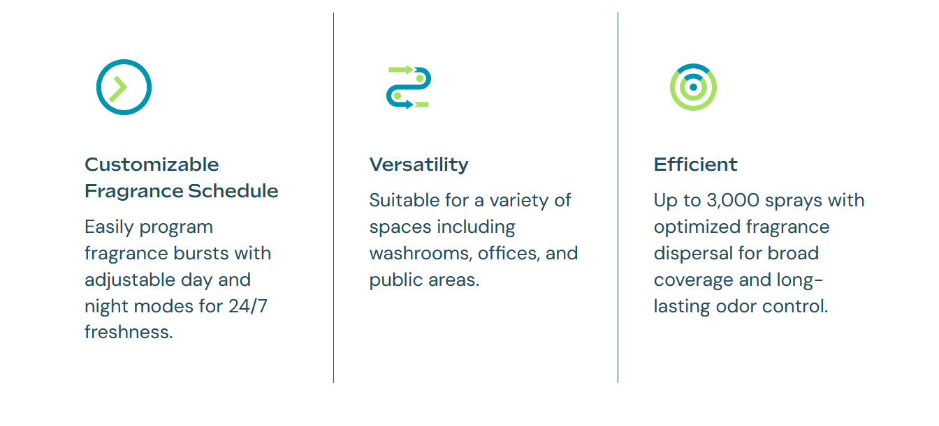 Its sleek, modern design blends seamlessly with any décor, making it ideal for washrooms, offices, hotels, and public areas. Engineered for optimized fragrance dispersal, the Micro Airoma provides long-lasting odor control and superior air care performance in a discreet form factor.